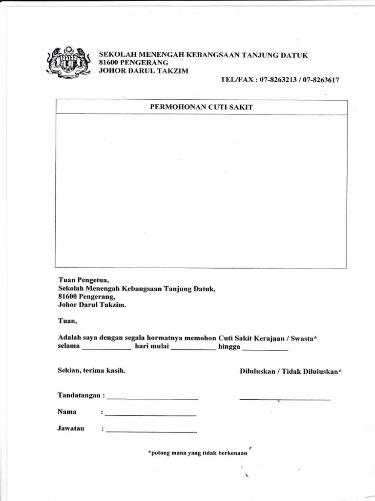 Borang cuti sakit kakitangan awam. 1 LAMPIRAN B JPASARAAN 22354-3 Jld. CUTI SAKIT Perintah Am PA 17 Bab C SYARAT Pegawai disahkan tidak sihat untuk bertugas oleh Pegawai Perubatan Lembaga Perubatan Panel Doktor. Hendaklah diisi dan ditandatangan ringkas sebelum borang.